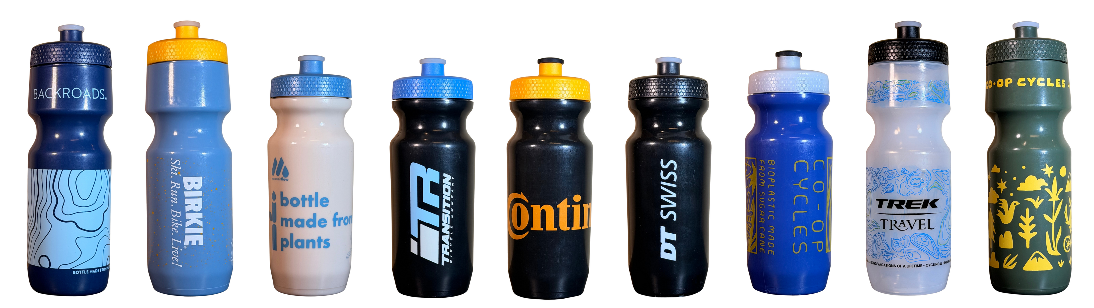 Tired of the same old bike water bottle? Our bottles are made with a carbon negative bio-plastic. And, get this, they still will work great as a water bottle ... leakproof, dishwasher safe, + recyclable.